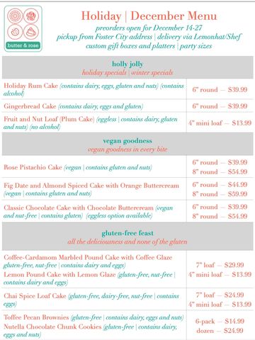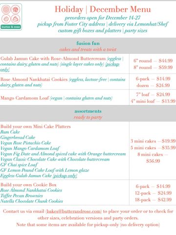 Some items, such as Gulab Jamun cake, are available for pickup only. Please Contact Us to arrange pickup from our Foster City address or from Foster City Farmers Market.