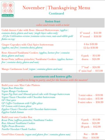 Select menu items will be available for pickup the weekend of November 15-16 if ordered right away. The remaining menu will be available through Thanksgiving Day.